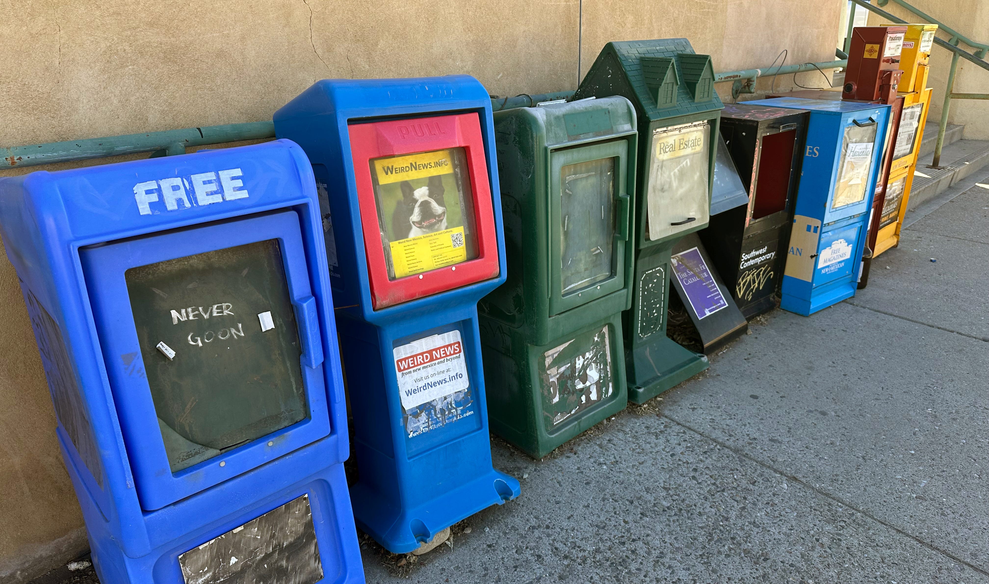 Nine of them clustered at a corner. Yellow, red, blue, brown. Still showing up every day to a job nobody gave them. The Santa Fe New Mexican, $1.00. A free magazine rack, its stock down to its last few copies. The Southwest Contemporary box has its door hanging open, and inside, where the magazines used to be, a single Starbucks cup, its plastic soft and caving at the rim. Someone has been using it as a trash can. Not maliciously. Out of practicality, which is its own kind of verdict on what the box is for now.