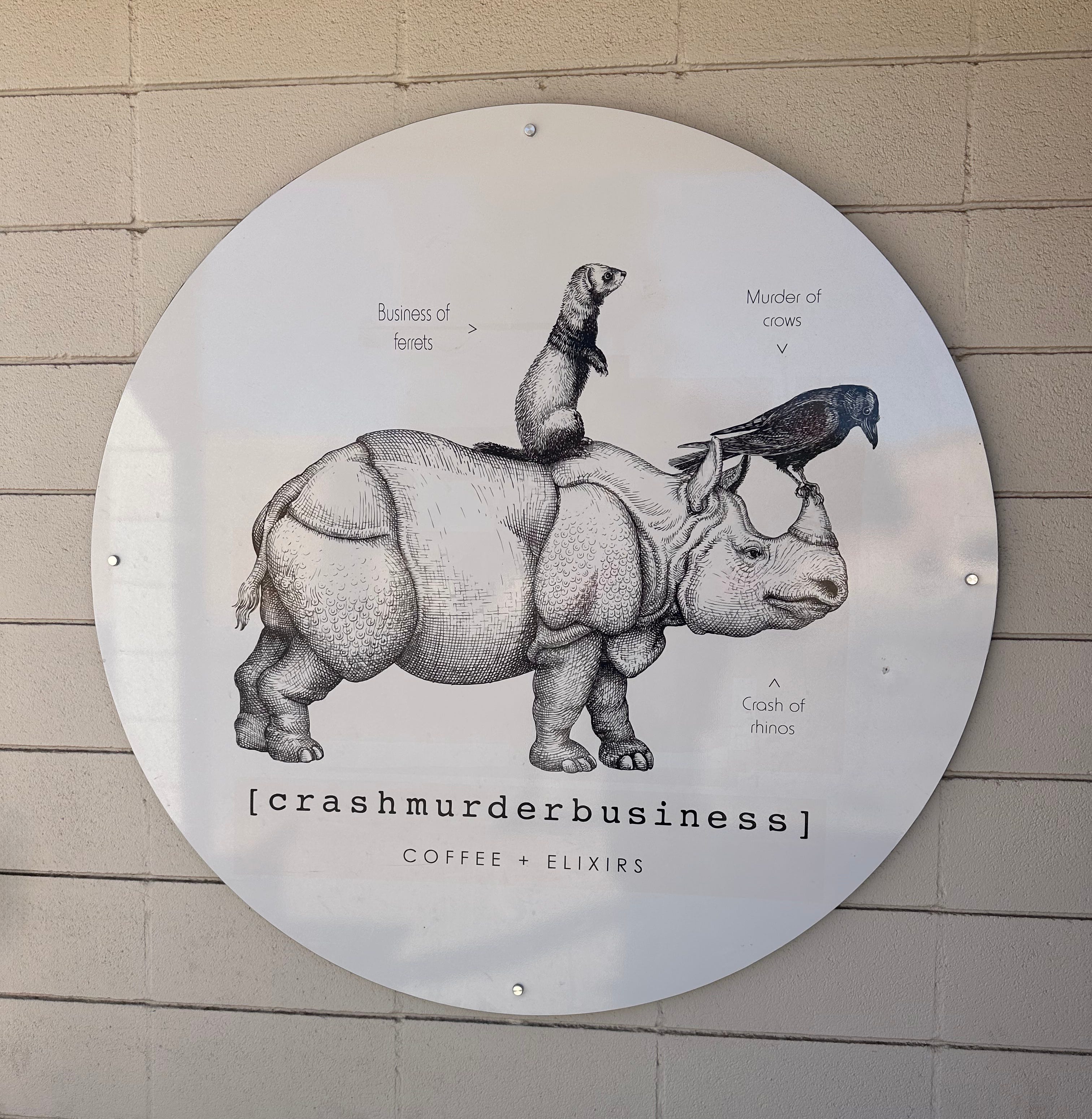 The block between the boxes and Crashmurderbusiness is two minutes on foot. By the time the sign appears, you are already deciding whether the rhino or the ferret is the more implausible logo, and by the time you’ve settled on the ferret, the door is open and the coffee smell has arrived.