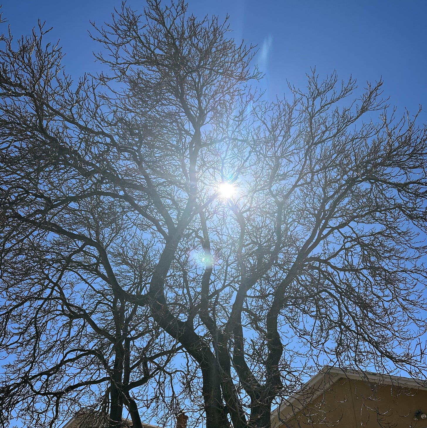 A bare cottonwood on the street in front of someone’s house. I stopped and looked up through it. The branches were holding the sun at their center, a white-hot point in deep blue, and the tree looked like it was waiting for something it already knew was coming. In a few weeks, the leaves will start. Today: just the architecture of it, which is enough. Three hundred sunny days a year make your chest open on the first block of a good walk.